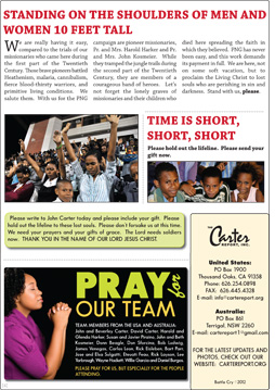 We are really having it easy, compared to the trials of our missionaries who came here during the first part of the Twentieth Century. Those brave pioneers battled Heathenism, malaria, cannibalism, fierce blood-thirsty warriors, and primitive living conditions. We salute them. With us for the PNG campaign are pioneer missionaries, Pr. and Mrs. Harold Harker and Pr. and Mrs. John Kosmeier. While they tramped the jungle trails during the second part of the Twentieth Century, they are members of a courageous band of heroes. Let’s not forget the lonely graves of missionaries and their children who died here spreading the faith in which they believed. PNG has never been easy, and this work demands its payment in full. We are here, not on some soft vacation, but to proclaim the Living Christ to lost souls who are perishing in sin and darkness. Stand with us, please.