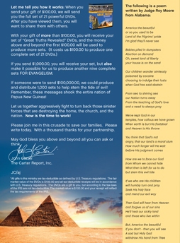 1.  When you send $100.00, we will send you the 21 DVDs that make up the “Great Truths Revealed” series.  After watching for yourself, you will want to place this powerful series in the home of a relative or friend.