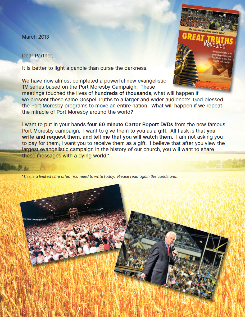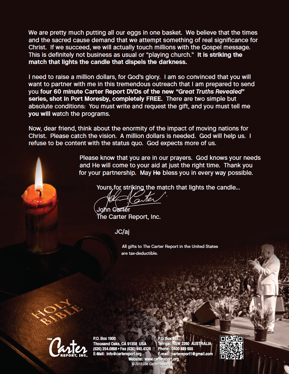 I need to raise a million dollars, for God’s glory. I am so convinced that you will want to partner with me in this tremendous outreach that I am prepared to send you four 60 minute Carter Report DVDs of the new “Great Truths Revealed” series, shot in Port Moresby, completely FREE. There are two simple but absolute conditions: You must write and request the gift, and you must tell me you will watch the programs.