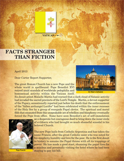 The great Roman Church has a new Pope and the whole world is spellbound. Pope Benedict XVI retired amid scandals of worldwide pedophilia and homosexual activity within the Vatican itself. Ex-Jesuit priest Malachi Martin had warned that a dark cloud of Satanic activity had invaded the sacred precincts of the Lord’s Temple. Martin, a devout supporter of the Papacy, sensationally reported just before his death that the enthronement of the “fallen archangel Lucifer” had been celebrated within the inner recesses of the Holy See by a group of renegade Papal clerics. The spiritual and moral filth that emanated from this unspeakable act of rebellion and blasphemy eventually forced the Pope from office. Some have seen Benedict’s act of self-immolation as a desperate but courageous deed to bring down the inner circle of evildoers who had brought so much shameful scandal to his beloved Church.