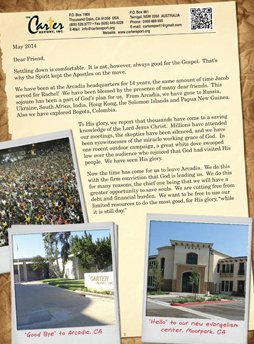 We have been at the Arcadia headquarters for 14 years, the same amount of time Jacob served for Rachel! We have been blessed by the presence of many dear friends. This sojourn has been a part of God’s plan for us. From Arcadia, we have gone to Russia, Ukraine, South Africa, India, Hong Kong, the Solomon Islands and Papua New Guinea. Also we have explored Bogota, Colombia.