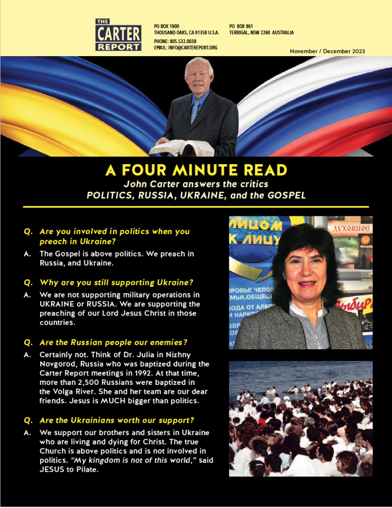 John Carter answers critics, POLITICS, RUSSIA, UKRAINE and the GOSPEL Click here to Download The Carter Report November-December 2023 Newsletter in PDF Version