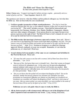 2. The Bible teaches that marriage is between a man and a woman. Jesus said, “Haven’t you read that at the beginning the Creator made them male and female, and said, ‘For this reason a man will leave his father and mother and be united to his wife, and the two will become one flesh.’” Matt. 19:4,5 Nowhere in Scripture is so-called Gay Marriage approved, blessed, condoned, or in any way accepted. Remember, it’s not what the politicians say, it’s what God’s Word says.